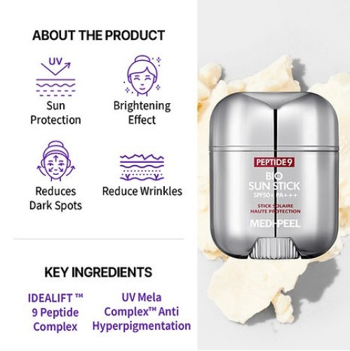 Το Peptide 9 Bio Sun Stick Pro SPF50+ PA++++ είναι ένα αντηλιακό σε μορφή στικ με προηγμένη σύνθεση που προσφέρει υψηλή προστασία από την ηλιακή ακτινοβολία, ενώ ταυτόχρονα ενυδατώνει και ενισχύει την ελαστικότητα του δέρματος. Η σύνθεσή του περιλαμβάνει: